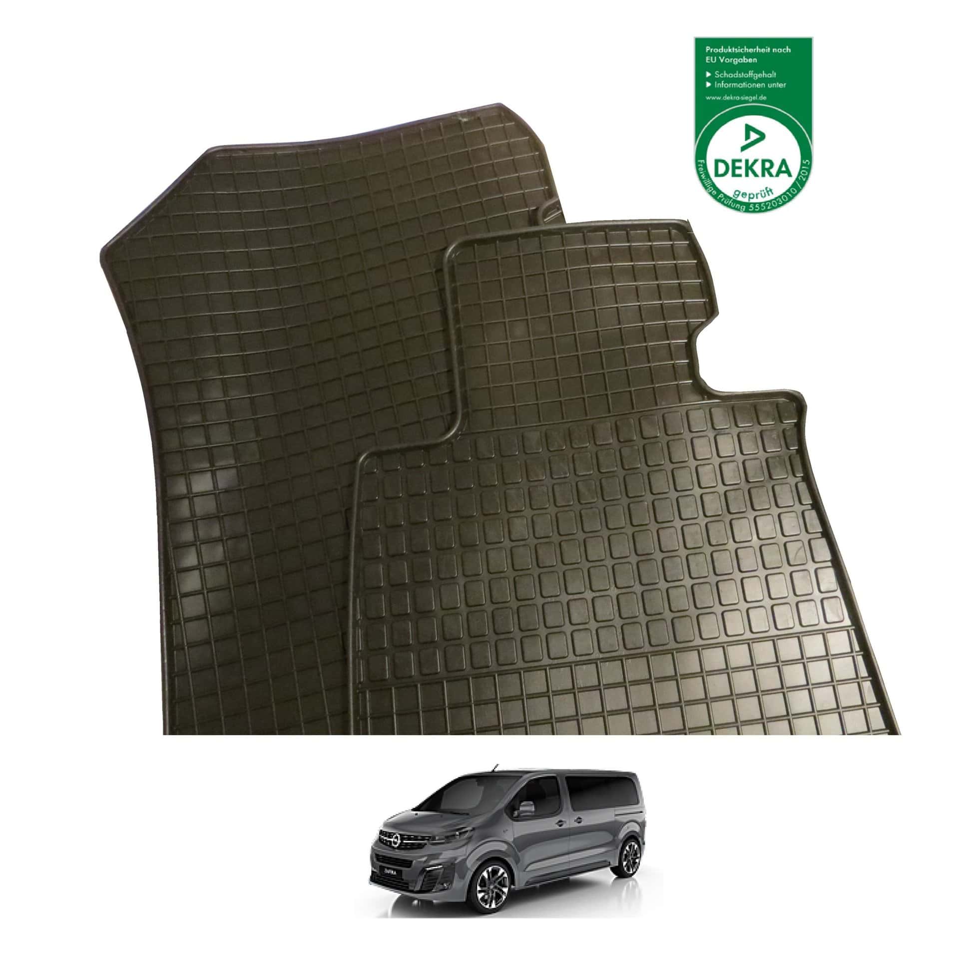 Es handelt sich um Gummimatten in Erstausrüsterqualität mit perfekter Passform für den Opel Zafira Life. Diese sind inklusive Befestigung an der serienmäßigen Fußmatten Halterung soweit diese vorhanden ist. Sie fangen sowohl Schmutz, Schnee, aber auch Dreck sowie jede Flüssigkeit dank des hohen Randes auf. Es sind zusätzliche Noppen an der Unterseite der Matten vorhanden, um ein Verrutschen im Fußraum zu vermeiden. Sie sind geruchsneutral und belästigen somit nicht Ihren gewohnten Fahrkomfort, dies ist durch die DEKRA überprüft und bestätigt.
