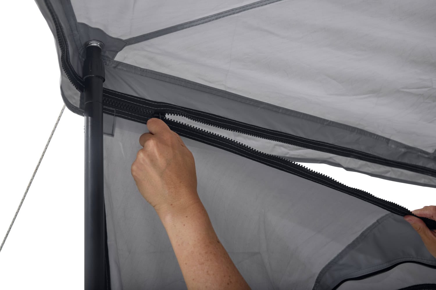 Verwandle Dein Thule Dachzelt mit den Thule Approach awning 2 walls in einen wettergeschützten Raum mit bis zu 13 qm Größe. Somit bist du privater beim Umziehen, schaffst zusätzlich Platz für deine Camping Gegenstände und schützt dich vor Wind, Regen und Sonne. Hergestellt aus 100 % recycelten wasserabweisenden 200D Polyester in zeitlosen grau. Im Lieferumfang sind vier unabhängige Wände enthalten, die auf individuelle Weise angeordnet werden können, um Deinen Bedürfnissen zu entsprechen. Alle Wände werden schnell an den Markisen der Zelte Approach sowie den Approach 2 mit den vorhandenen Reißverschlüssen verbunden.