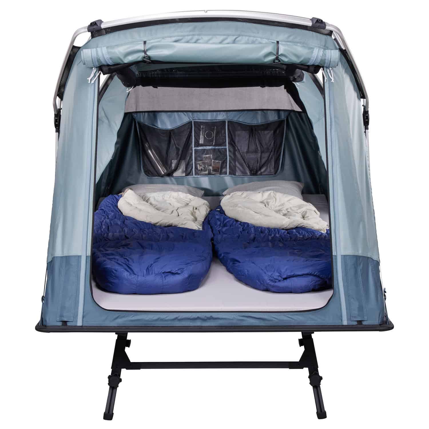 Dank des geräumigen Innenraums kannst Du im Zelt aufrecht sitzen und bequem Zeit mit Freunden und Familie verbringen. Die bequeme 7 cm dicke Matratze bietet erstklassigen Komfort und kann einfach im Zelt gelassen werden, wenn du wieder abreist. Große Türen und Fenster sorgen für gute Belüftung und einen Panoramablick, während die Fenster teilweise aufgerollt werden können, um die Privatsphäre zu wahre. Das abnehmbare Regenverdeck schützt Dich vor den Witterungsverhältnisse. Die Innentasche im Zelt helfen die Ordung zu halten. Für die Sauberkeit Außen hilft die abnehmbare Reiseabdeckung und hält das Zelt auf Reisen trocken und frei von Schmutz.